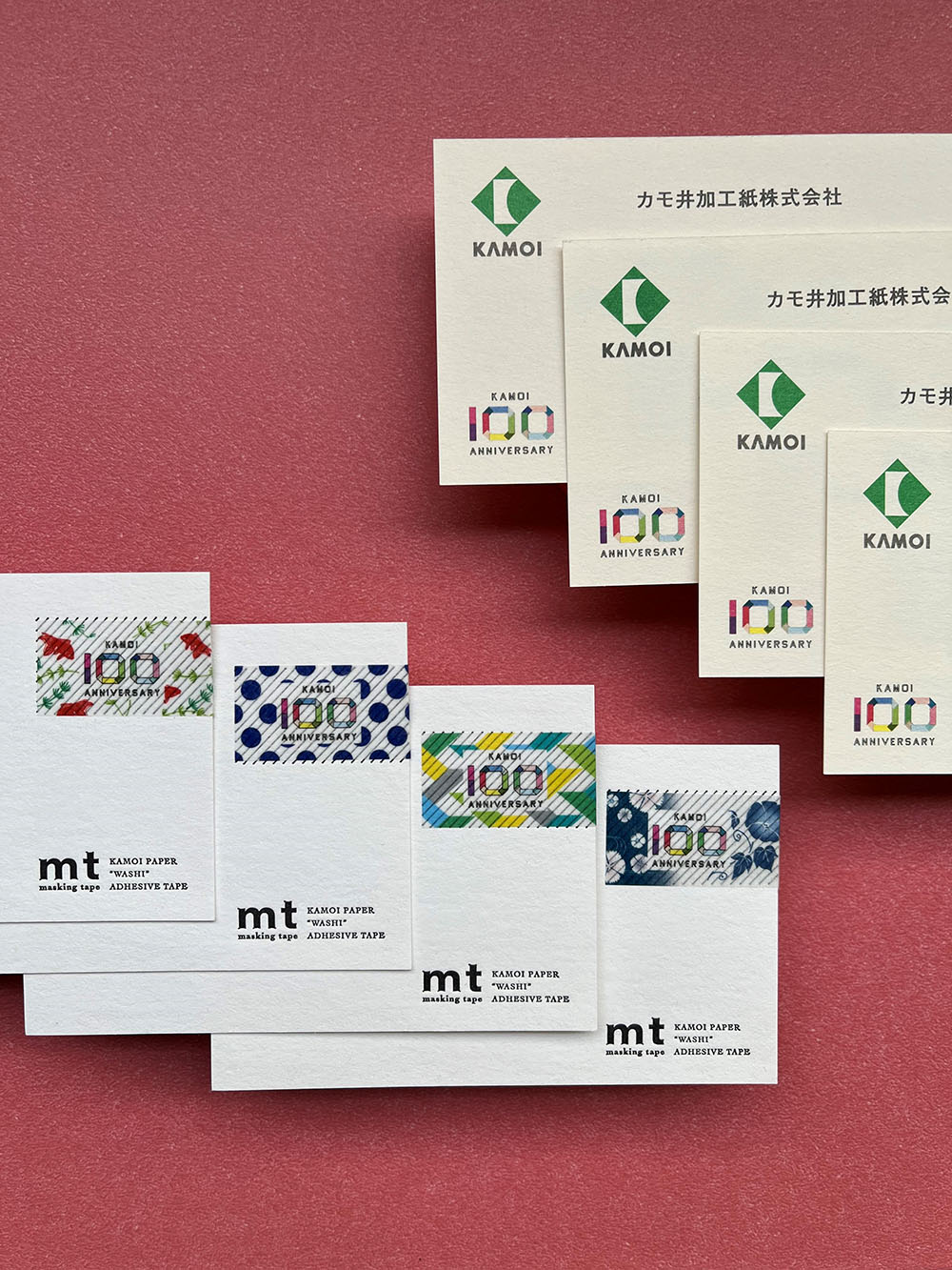 カラフルな100周年記念ロゴを入れた名刺を作成しました。今年一年はこちらの名刺を使ってまいります。mtを取り扱うコンシューマー部は、ロゴ入りのテープを名刺に貼り付けています。複数のテープデザインがありますので、名刺交換の際は、どうぞお楽しみに。